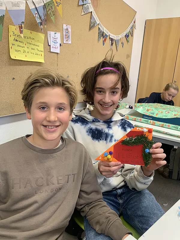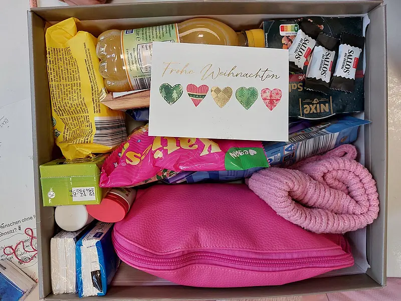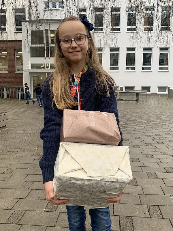 Felix, Julian und Tim sind ganz bei der Sache: Die Siebtklässler verstauen mitgebrachte Hilfsgüter in einen großen Pappkarton. Geschenkpapier, Schere und Klebefilm liegen bereit. „Im Paket ist alles dabei, was man so braucht“, erklärt Klassenkamerad Paul am Nachbartisch – und zählt auch gleich beispielhaft Produkte auf: Ravioli, Linseneintopf, Socken, Schokoriegel, Hautcreme und Zahnpasta. „Das ist alles mindestens zwei Jahre haltbar. Und einen Gruß gibt´s auch noch“, ergänzt der Junge und legt eine handgeschriebene Karte mit guten Wünschen auf die Hilfsgüter.