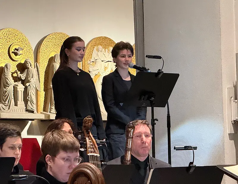 Die Schülerinnen und Schüler unseres Theater-Additums (Leitung: Birgit Müller und Petra Max) haben unter Einbeziehung des Regisseurs Alexander Radulescu Kurzfilme erstellt und darin ihren Weg zu den Passionen beschrieben. Es ergaben sich Darstellungen aus dem Hier und Heute von unglaublicher Intensität und Authentizität. Die Bibeltexte, vorgetragen von der Schauspielerin Franziska Hartmann, Texte von Schülerinnen und Schülern sowie Szenen des chorischen Sprechens ergaben zusammen mit der Musik von Johann Sebastian Bach ein harmonisches Ganzes. Unsere Kulturbotschafterinnen Thalia und Mathilda fungierten als Sprecherinnen und präsentierten im Zusammenspiel mit Franziska Hartmann großartig die Schülertexte.