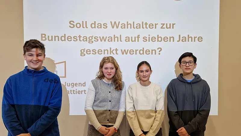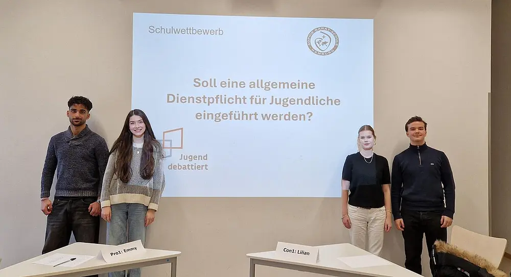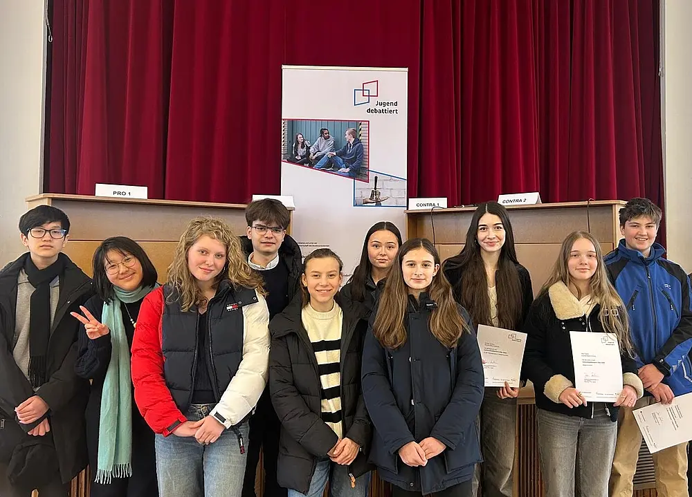 Wir sind sehr stolz auf unsere Schülerinnen und Schüler, die in diesem Jahr am Schulwettbewerb Jugend debattiert teilgenommen haben. In der Altersklasse 1 diskutierten Silvester, Carmen, Mathilda und Keanu die Frage, ob das Wahlalter auf sieben Jahre gesenkt werden soll, während Lilian, Emmy, Daniel und Armin in der Altersklasse 2 über die Einführung einer allgemeinen Dienstpflicht stritten.